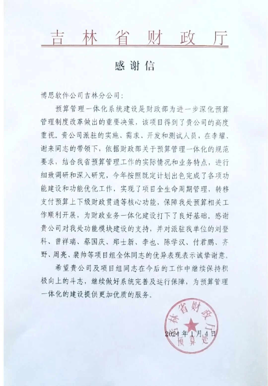 编者按:2024年新年伊始,博思软件吉林分公司(下称吉林分公司)预算管理一体化建设项目组收到一封来自吉林省财政厅预算处的感谢信。小编专访项目团队成员,分享他们的奋斗故事与心路历程。
