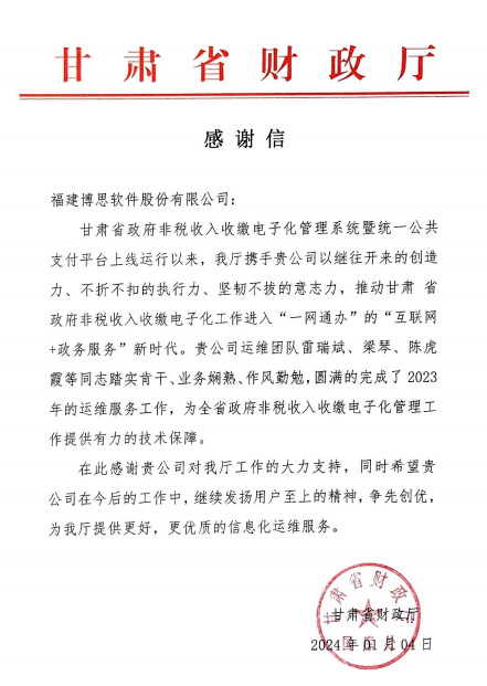 为加快推进服务型政府建设,建立与公共财政管理和社会信息化发展相适应的政府非税收入收缴电子化管理新机制,按照甘肃省政府办公厅印发的《甘肃省全面推进政府非税收入收缴电子化管理改革实施方案》要求,甘肃省政府非税收入收缴电子管理系统暨统一公共支付平台于2018年7月1日0时正式上线运行。多年来,博思团队全力保障系统平稳运行,并不断推进技术创新,助推甘肃省政府非税收入收缴电子化工作进入“一网通办”的“互联网+政务服务”新时代。